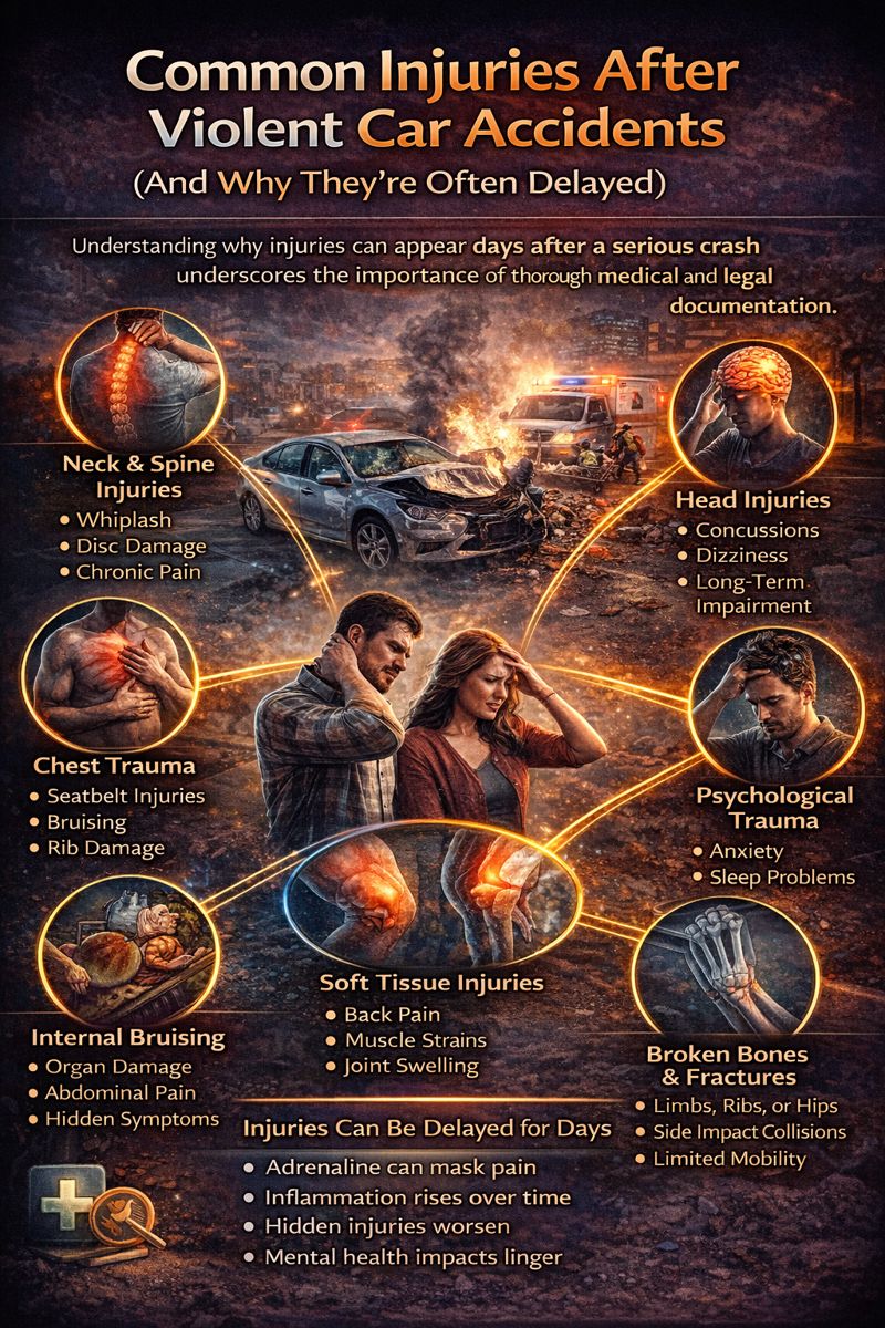 Violent roadway collisions often leave lasting effects that are not immediately obvious at the scene. The body absorbs force in complex ways, and symptoms may surface gradually as adrenaline fades. Understanding how injuries commonly appear after high-impact crashes helps explain why thorough medical and legal review matters.